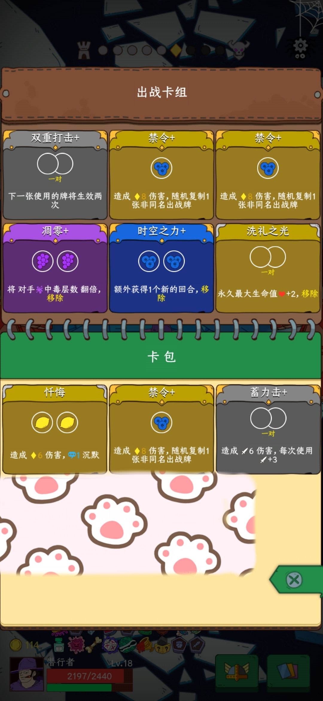 2. 如果对手带净化或者反弹debuff的装备,你可以把剧毒眼球的装备下了,把凋零换成伤害牌,最好是伤害可以叠加的,例如我上面带的蓄力击,利用回合制,把蓄力击的伤害不断往上拉,最后一下终结掉BOSS,如果你想玩的有趣点,也可以带忏悔(造成6伤害,1沉默),每回合都把对手的手牌沉默掉,让他有牌也没用。