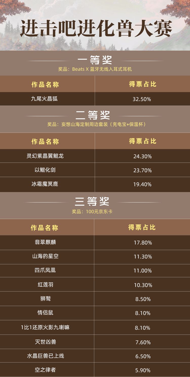 各位旅者好,经过几天激烈的角逐,我们的【进击吧 山海进化兽】活动的票选结果正式出炉了!看到旅者们的踊跃参与和积极投票,本咪深感欣慰~感谢旅者们一如既往的支持!话不多说话不多说,这么好的消息本咪要赶紧跟各位旅者分享一下!快来看看丰厚的奖励到底花落谁家吧丰厚奖励到底花落谁家吧!