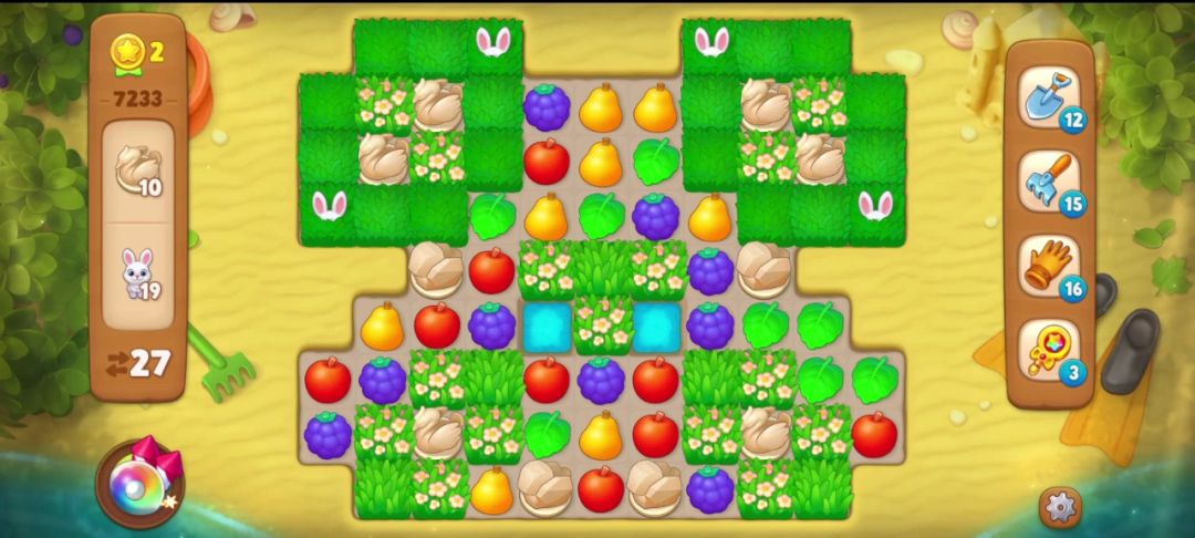 ①观察开局:天鹅雕像和小兔子都被草地围着,而天鹅雕像只能用道具才能清除,所以我们在清除草地的时候要尽可能多的制造道具,既能收集天鹅雕像也能攒能量凑双彩!