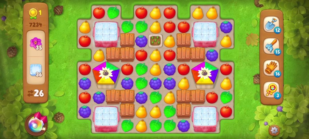 此时场上的花朵不够完成收集目标,所以只用在花坛旁匹配让其释放出足够的花朵,就可以用双彩一次性收集完剩下的目标!幸运通关~