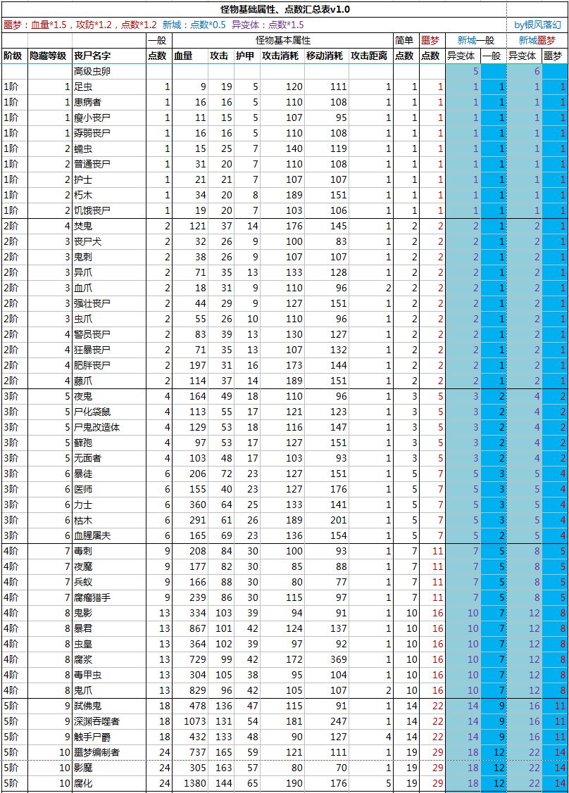 怪物基础属性、战斗点数汇总表(含新城、异变体)