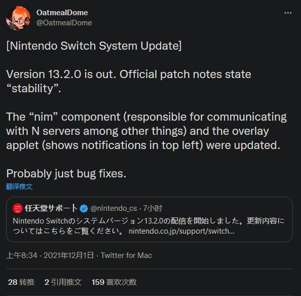 任天堂数据挖掘者 OatlmealDome 透露了一些除了官方宣称以外还可能在后台更新的额外内容。在推特上他说道:“‘nim’组件(负责与任天堂服务器等进行通信)和覆盖小程序(在左上角显示通知)已更新。可能只是一些小 BUG。”