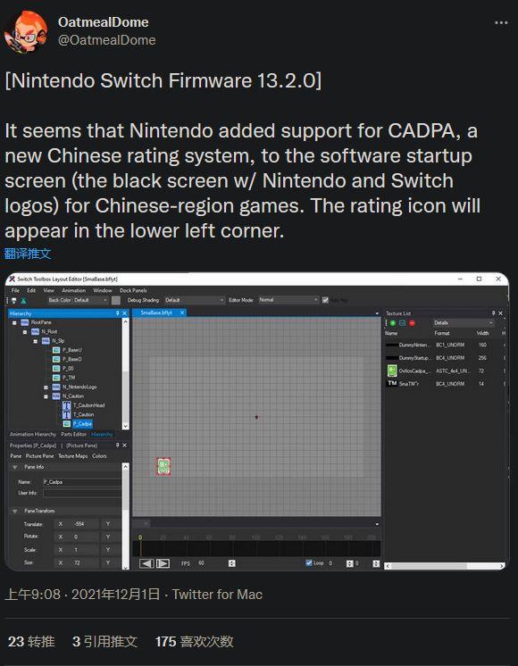 “似乎任天堂在中国地区游戏软件启动屏幕(带有任天堂和 Switch 标志的黑屏部分)中增加了对 CADPA(中国新的评级系统)的支持。评级图标将出现在左下角。”