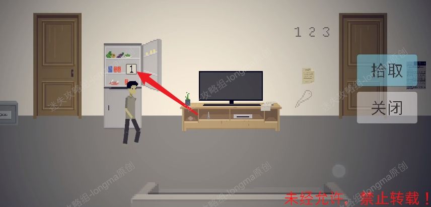 1.打开冰箱,点击拾取,得到【写着1的方块】。1