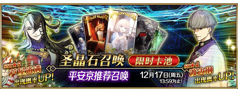 为了纪念「地狱界曼荼罗平安京 轰雷一闪」开幕,限时卡池「平安京推荐召唤」开启!