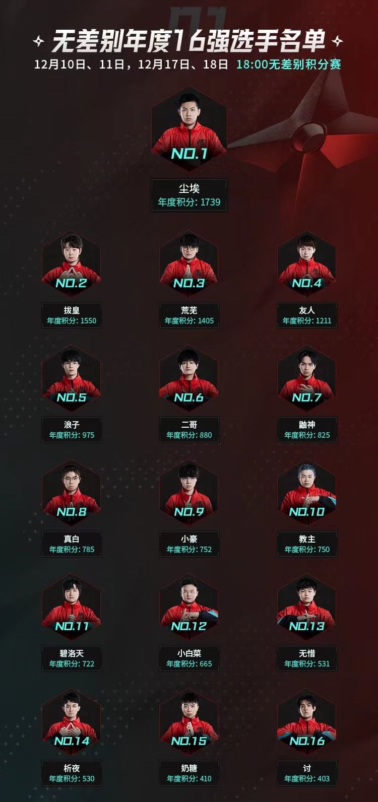 距离2021年无差别年度总决赛越来越近,无差别年度16强终于诞生啦!他们将在12月10日至11日、12月17日至18日每晚18:00进行无差别积分赛的比拼,究竟谁能成功晋级年度8强?让我们拭目以待!