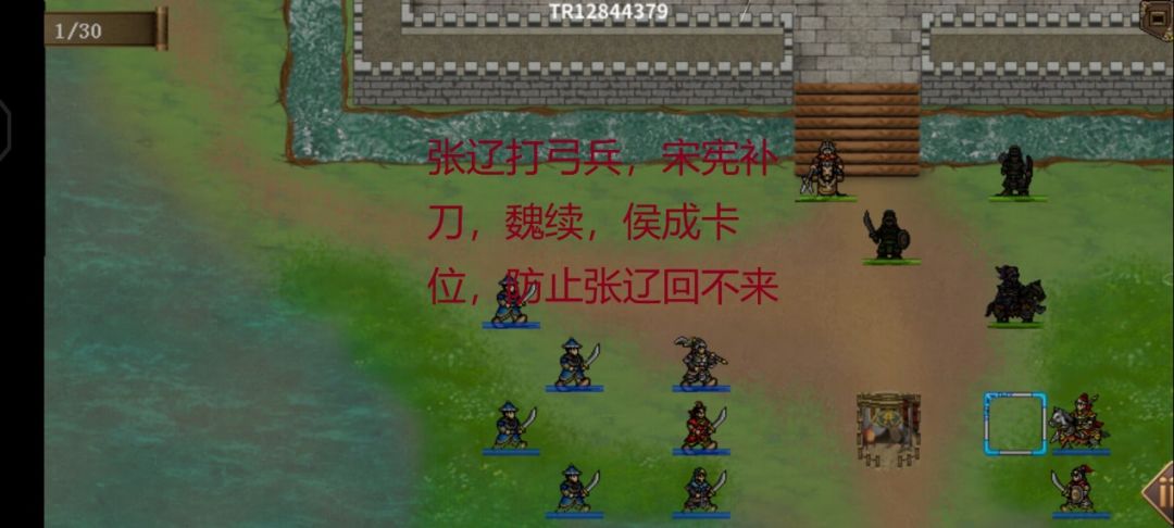 其他:这关开局我军加防御,魏续移动到图中合格位置,等会张苞过来就能触发单挑了,藏霸最好不要到山地上,不然对面会放法术打他,主要靠反击打伤害,主动回合放咒骂减防将领就行。沮鹄补血或者输出视情况而定,很容易的一关。