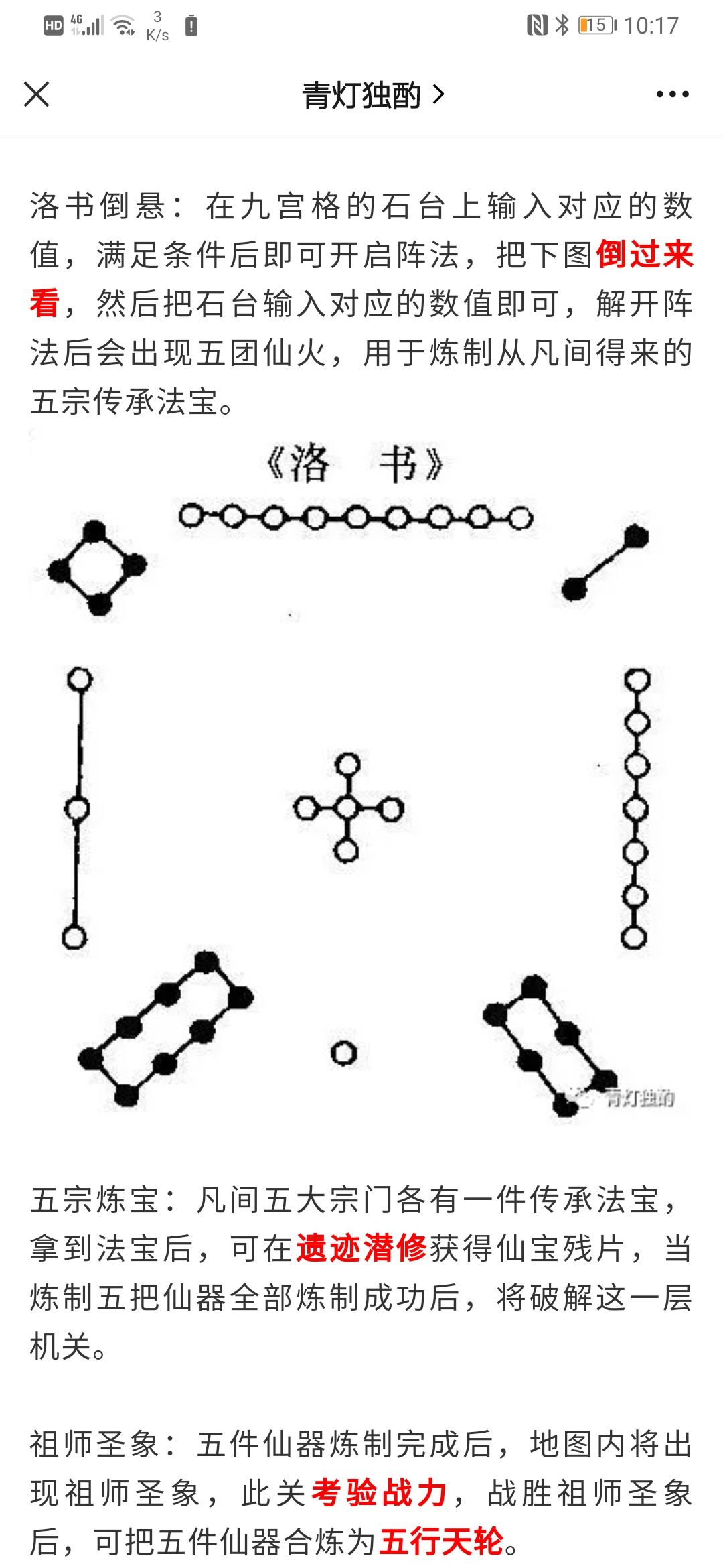洛书倒悬:在九宫格的石台上输入对应的数值,满足条件后即可开启阵法,把下图倒过来看,然后把石台输入对应的数值即可,解开阵法后会出现五团仙火,用于炼制从凡间得来的五宗传承法宝。