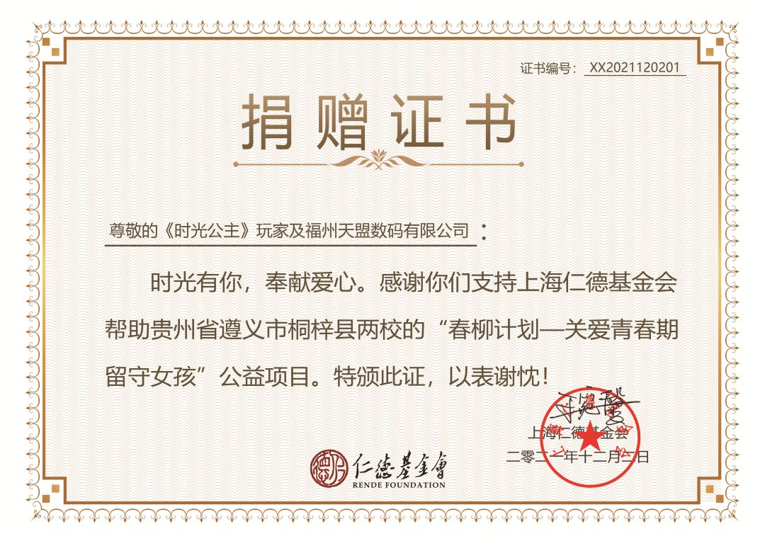 时光公主|“旅人互助-春柳复苏之行”公益活动捐赠证书