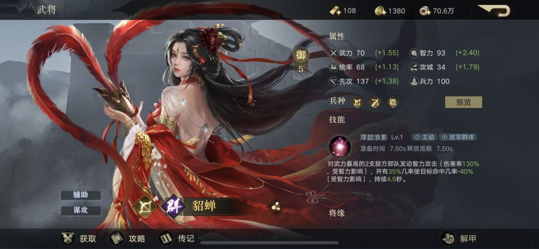 貂蝉的技能能对武力值最高的敌方2名武将造成较高智力伤害,并且满级后能降低50%的命中几率,用来对付高输出的武力武将是一个不错的选择![[嗒啦啦2_吃瓜]](https://img.tapimg.com/market/images/6eb1d083dff1c09692102cb5a98727f3.gif)