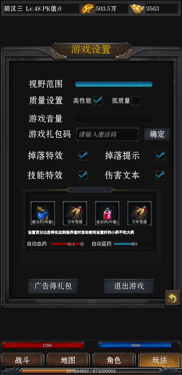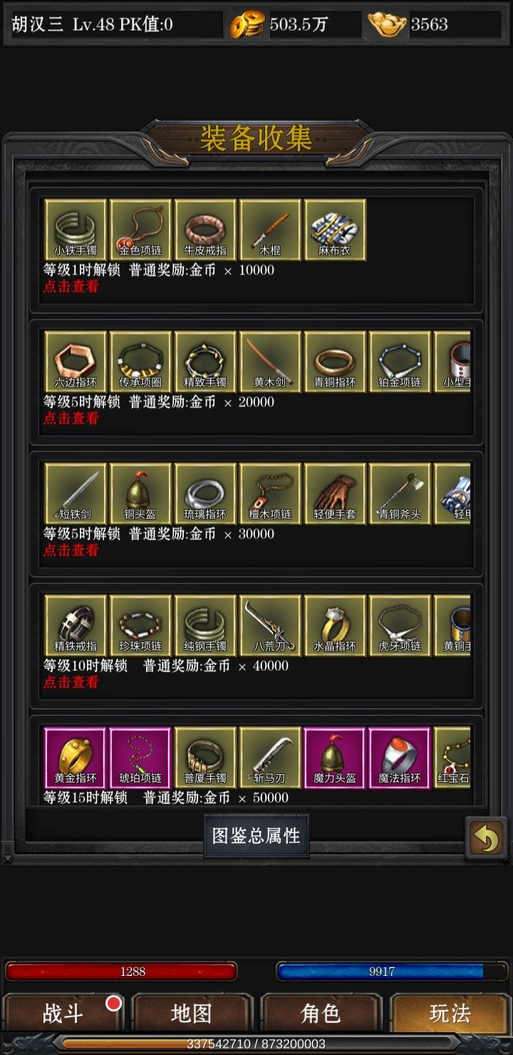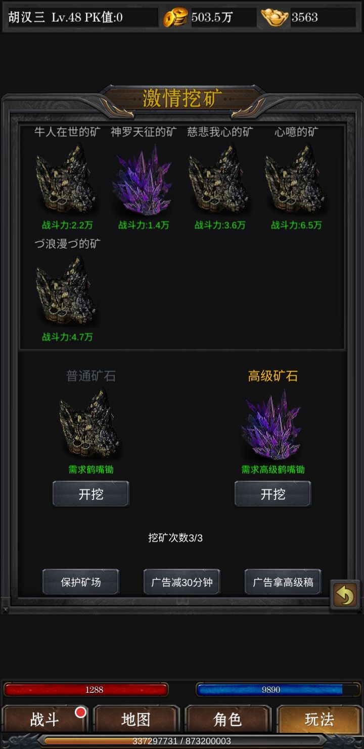 挖矿是金币重要来源,每天两个广告,收两个高级锄头,外加商店买的一个锄头,挖三次,还可以攻打别人矿场五次,除了黑铁矿(铁匠铺加装备部位等级,提高整体属性)和金矿(洗装备颜色)外,全部都卖,大概一千多万一天。