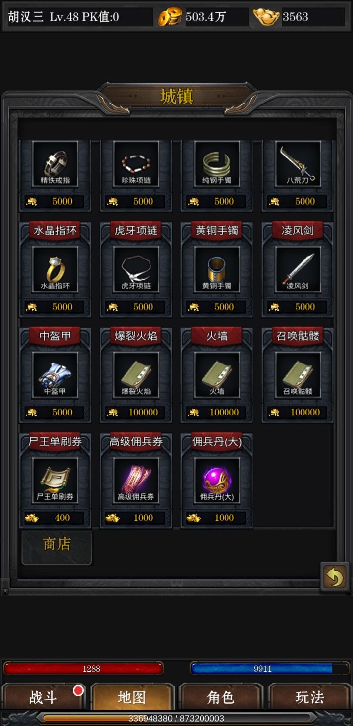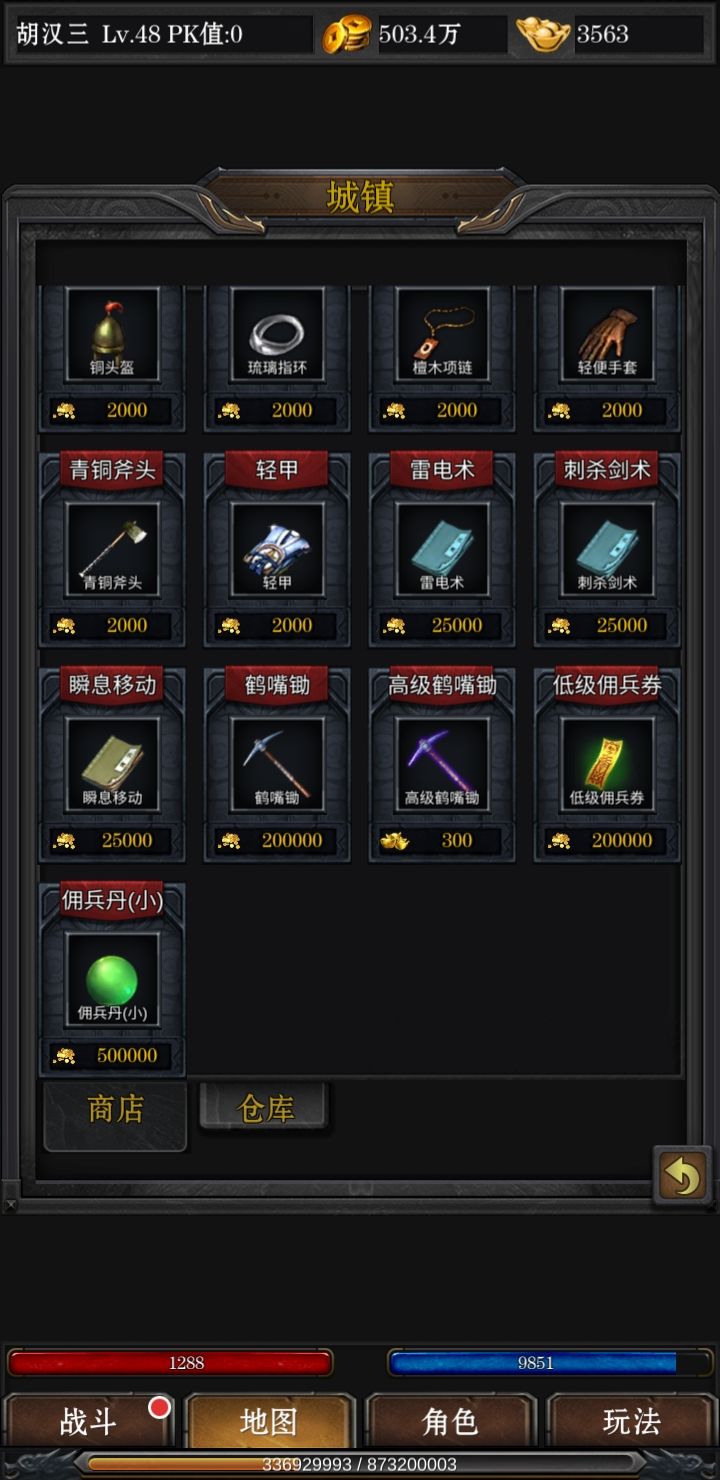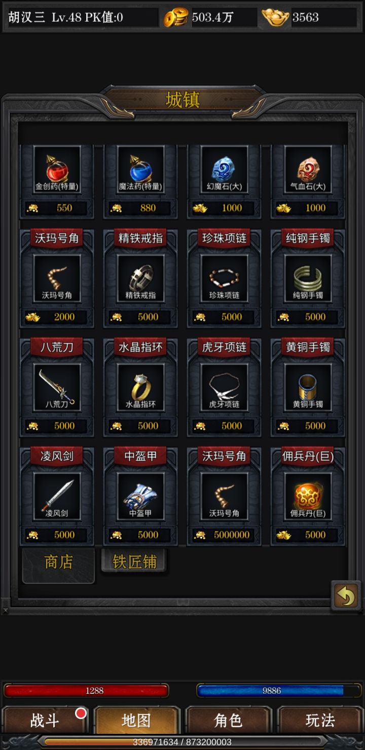 接下来我们介绍一下地图中各个城镇卖什么东西,前期血石不用合太高,费钱费力,后期买更高级的就可以,其次刺杀剑术和锄头每天都要买,前期把刺杀点满,用来爬塔(后面我会贴图,击杀boss上一层塔,后期转生需要boss掉落的转生石),至于元宝道具,除了血石全买尸霸门票,技能书掉落只看它!元宝来源不用担心,每天稳定500+,不用氪金,并且也没有充值页面给你充值。