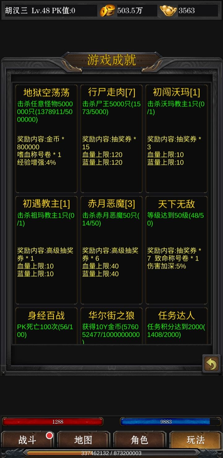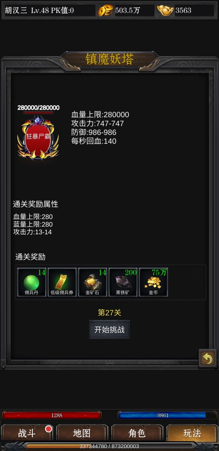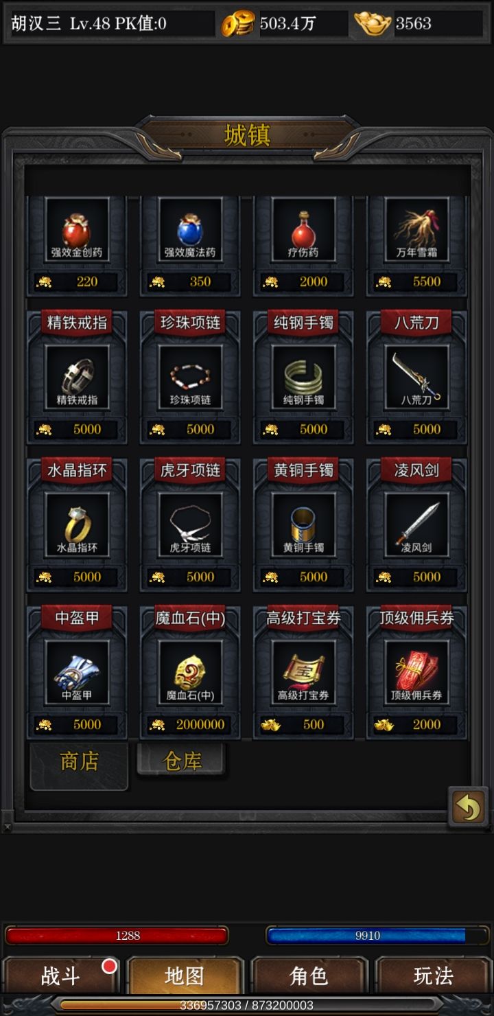 接下来我们介绍一下地图中各个城镇卖什么东西,前期血石不用合太高,费钱费力,后期买更高级的就可以,其次刺杀剑术和锄头每天都要买,前期把刺杀点满,用来爬塔(后面我会贴图,击杀boss上一层塔,后期转生需要boss掉落的转生石),至于元宝道具,除了血石全买尸霸门票,技能书掉落只看它!元宝来源不用担心,每天稳定500+,不用氪金,并且也没有充值页面给你充值。