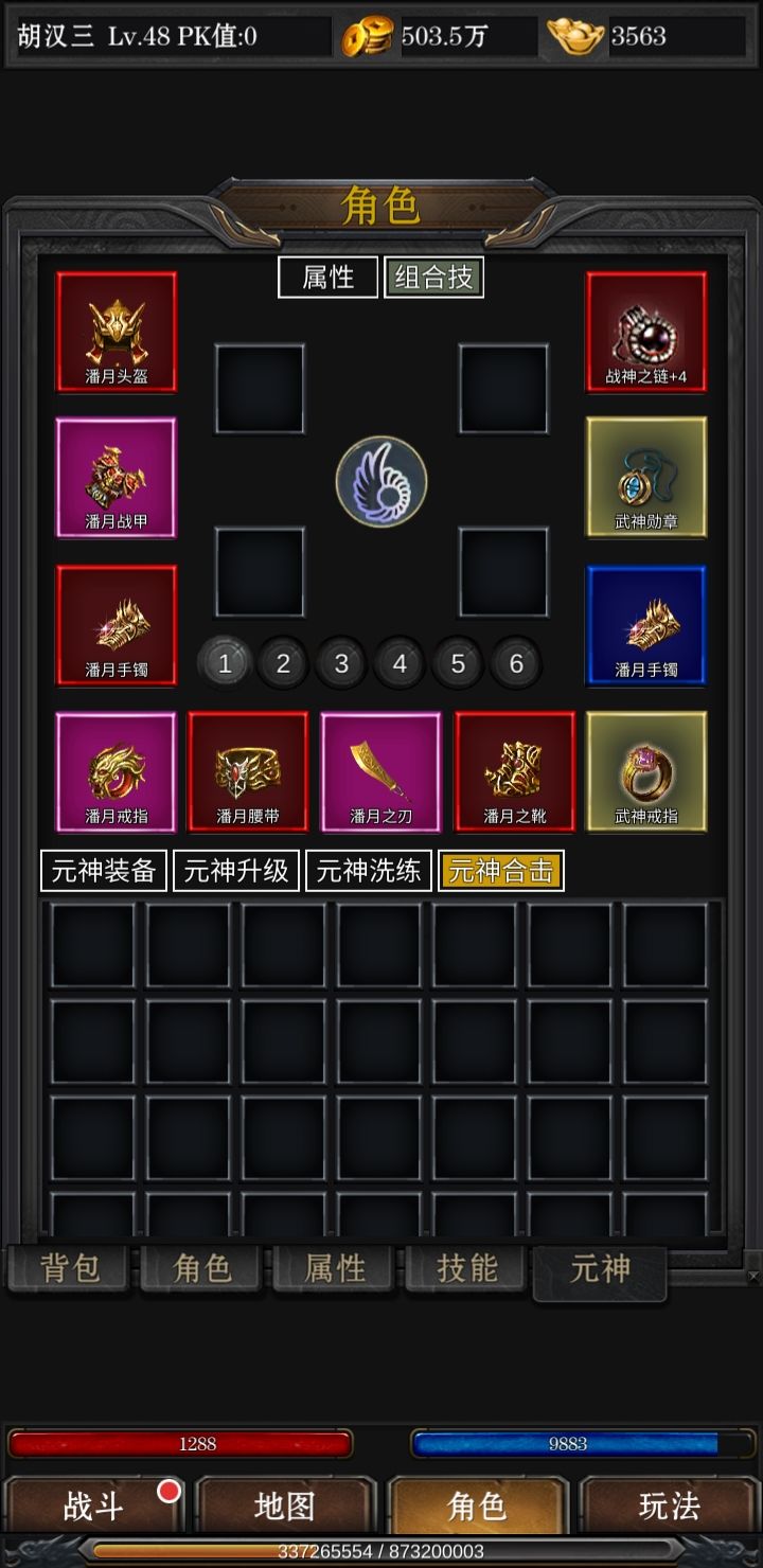 >_<下面是角色面板,到一定等级把武器幸运点满,攻击叠最大攻击,防御整体提升,血量不是最关键,伤害减免重要过血量,伤害加深和暴击率暴击伤害选择其中一种提升(之前暴击伤害低,现在改回了,暴击可以玩。),幸运值最高10,满了次次最高伤害(不算暴击),战斗力随着等级技能等级以及各个数值的增加而增加,转生则会增加回血回蓝和攻击血量等的提升,并且可以进入相应转生等级的地图获取相应的转生装备,转生一次掉五级,最好能转生立马转,效益最大化。