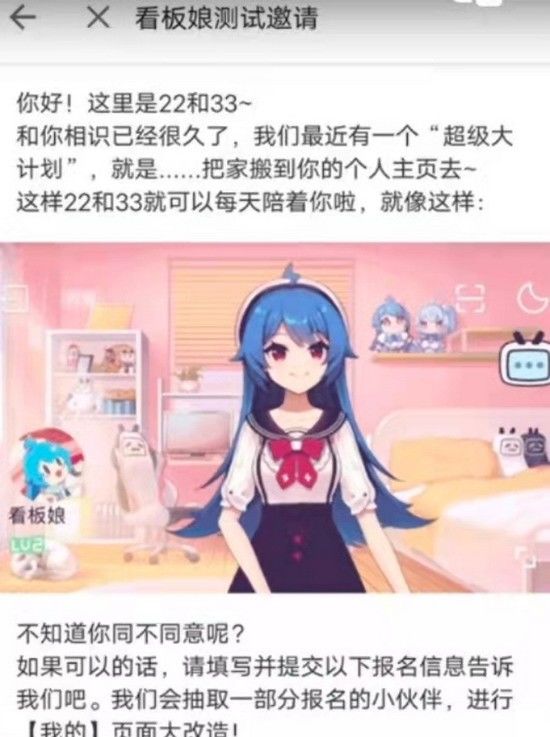 今日(12月2日)据国内媒体报道,近期有网友收到了B站新功能测试的邀请,项目测试名为“看板娘测试”。测试邀请显示,B站将把标志性虚拟人物“看板娘”搬到用户个人主页的背景中,用户可以像QQ秀一样,对看板娘本人和看板娘的家进行打扮。