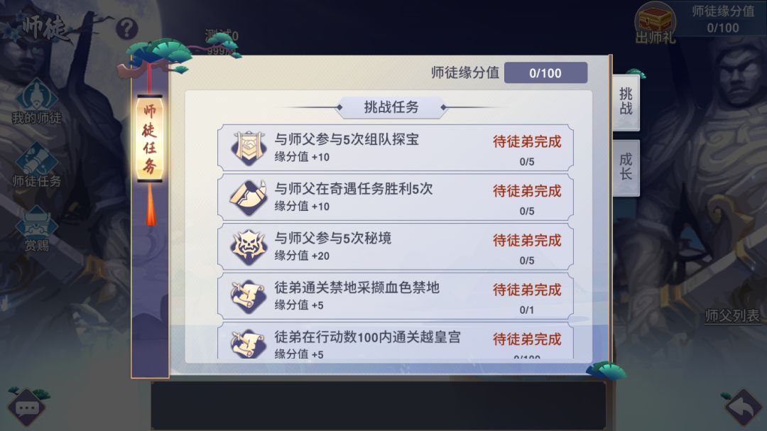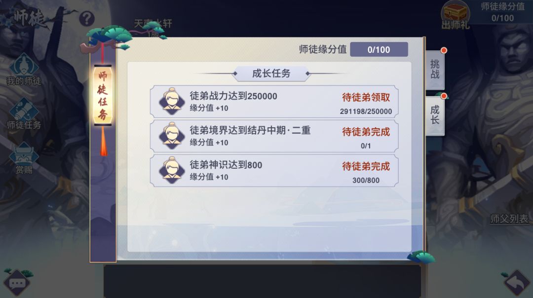 而成长任务则是徒弟的个人任务,对徒弟的战力,境界,神识等有一定的要求。而在成长任务中一共可以获得30点缘分值。