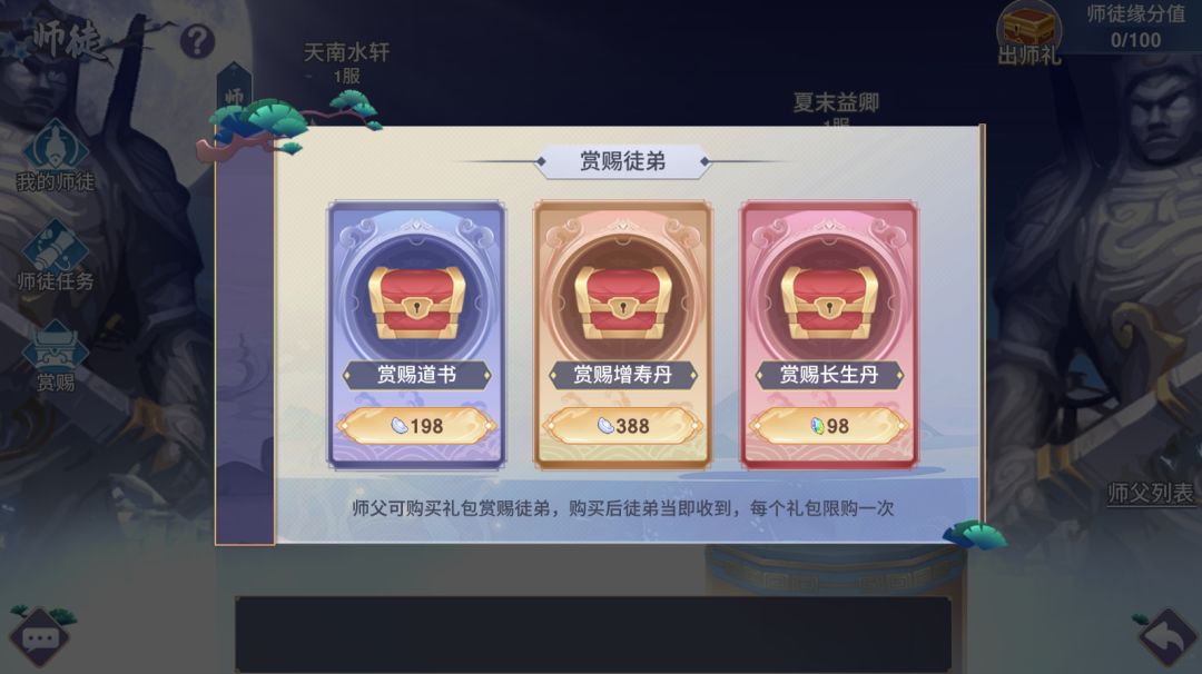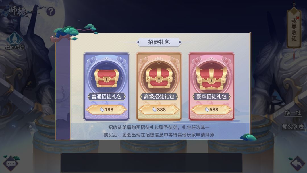 首先作为徒弟可以拜师,而师傅可以选择赠送徒弟拜师礼,有三个不同级别的拜师礼可以选择,分别是198,388和588银两。那作为徒弟,自然选择拜师礼多的师傅啦~试问有哪个徒弟不喜欢豪华大礼包呢?