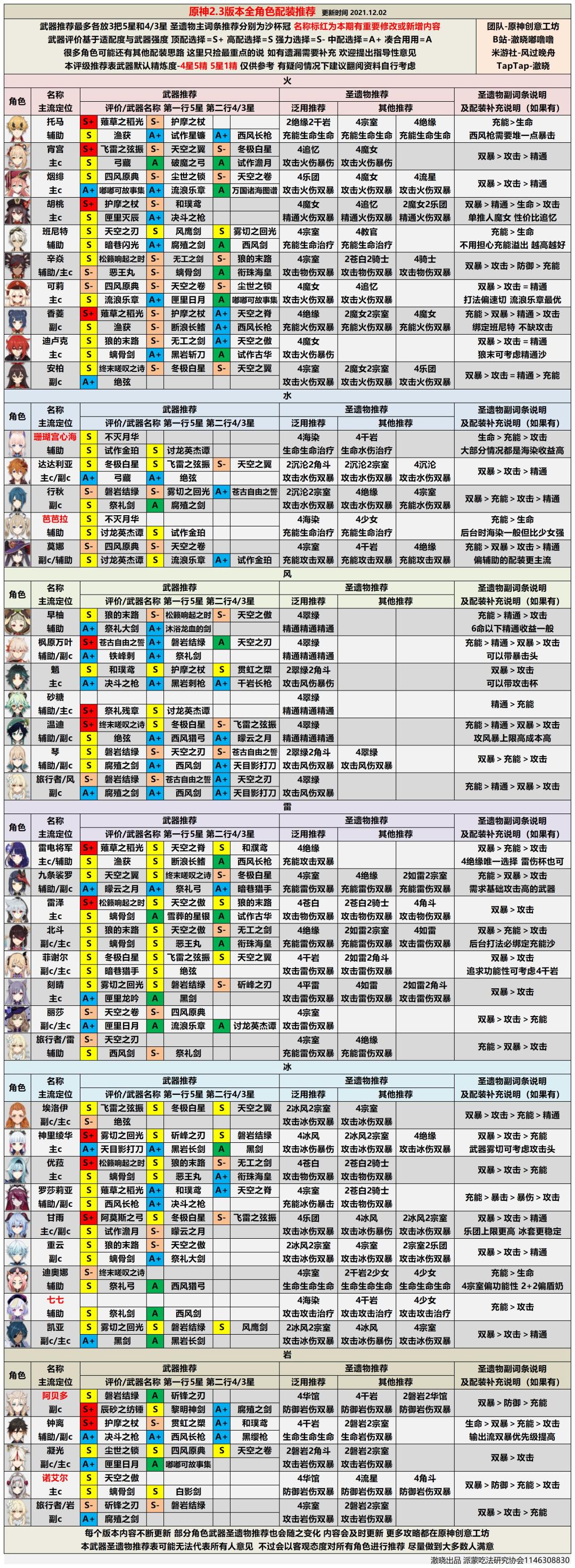 其实配装表前几天就做好了,但是深渊马上更新了,所以还是决定等一波新深渊,把评级的内容结合新深渊环境再给各位发出来,就推迟了两天。