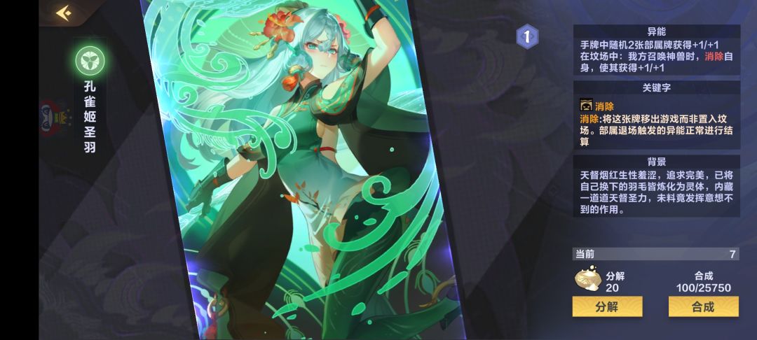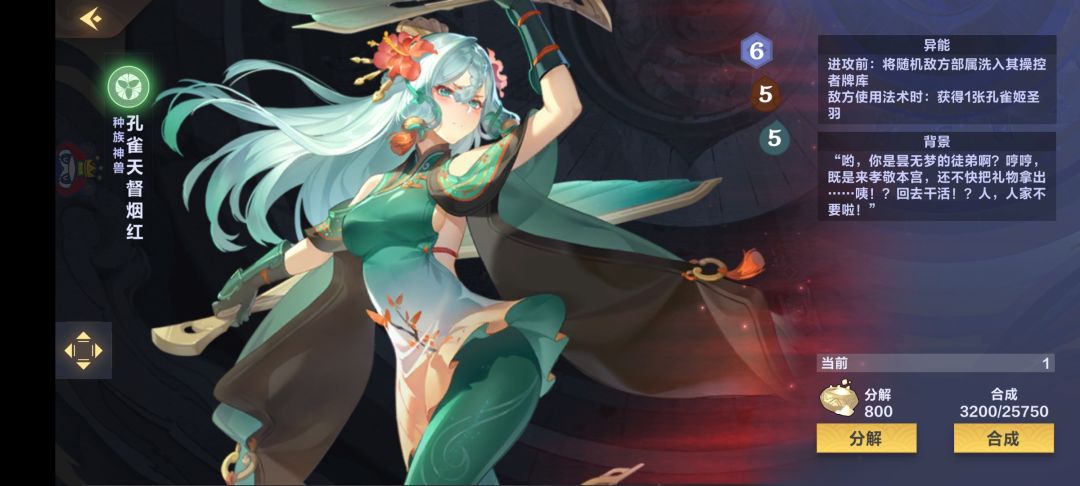 孔雀天督也是神助攻之一,只要能站场2-3回合,不光对对面场面是压制,还能限制对方使用法术,进攻前可以洗掉对方部署进牌库,对方使用法术就能获得羽毛。注意羽毛不要屯,争取尽快用掉,不然会导致我们爆手牌的,不要去管当时手里有什么部署,在保证主将自身安全的前提下,无脑用掉羽毛,因为在墓地的羽毛还可以让我们召唤下场的龙女等神兽再涨一波身材!