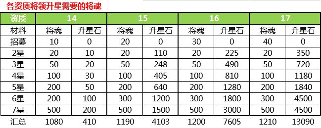 Q13、各资质武将升星需要的将魂及升星石数量?