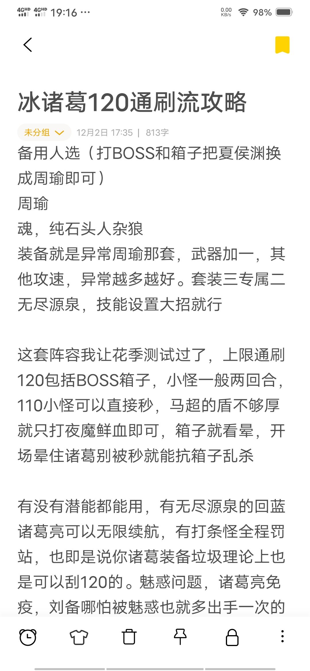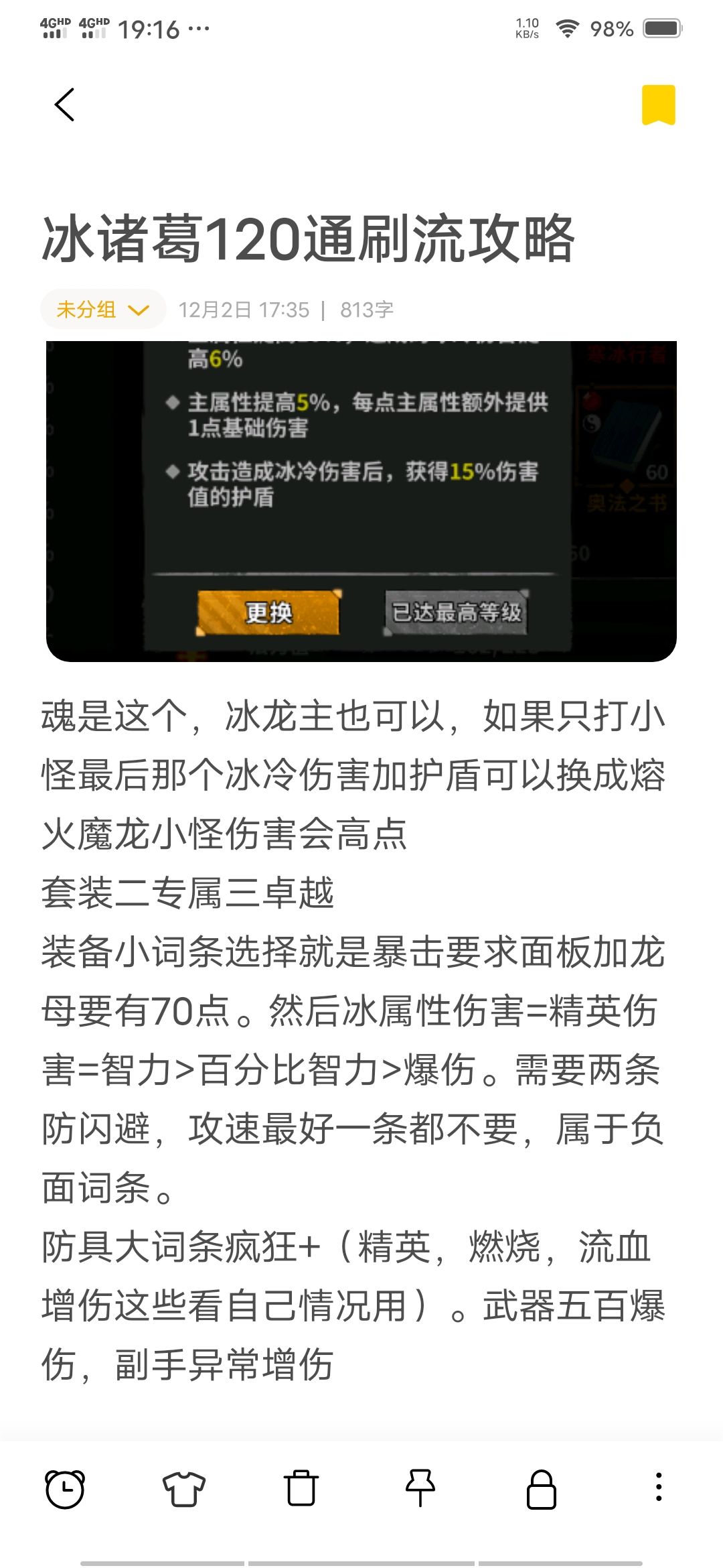 新版本冰诸葛120通刷流攻略,小怪BOSS箱子通刷,补充一下,典韦不需要专属,因为专属没效果,攻速2.6拉满就行,加上三件无尽套装就可以上岗了,周瑜和夏侯渊可以不用无尽,大不了BOSS没蓝了普攻一次就又回起来了,小怪有打条也是一样,另外马超的速度要拉到2.0,夏侯渊最少1.7(越高越好)。诸葛亮打不能一次秒的层数最好杂一个冰伤转护盾,夏侯渊压不住怪的话马超直接大招接2套盾,马超体力堆起来。诸葛亮回蓝要是不够的话弄一条击杀回蓝,如果你伤害实在低硬是要刮痧的话推荐大词条暴击回蓝