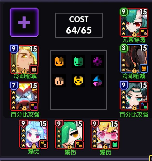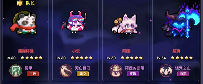主攻:熊猫x1(两只防止掉buff,要是两只都没续上的话,那我恭喜你中奖了)贝利x2(为什么不带天狗?因为输出频率低,抢不到触发)