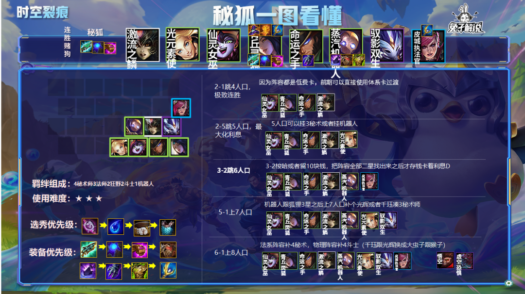 一图上钻更新了秘狐的相关羁绊,大家微信搜索公众号兔子解说首页回复1就可以随时拿到最新4K版本的一图上钻了,阵容,装备组合,手法,羁绊一应俱全,轻松上钻!(S6双城之战关注兔铲铲之战)