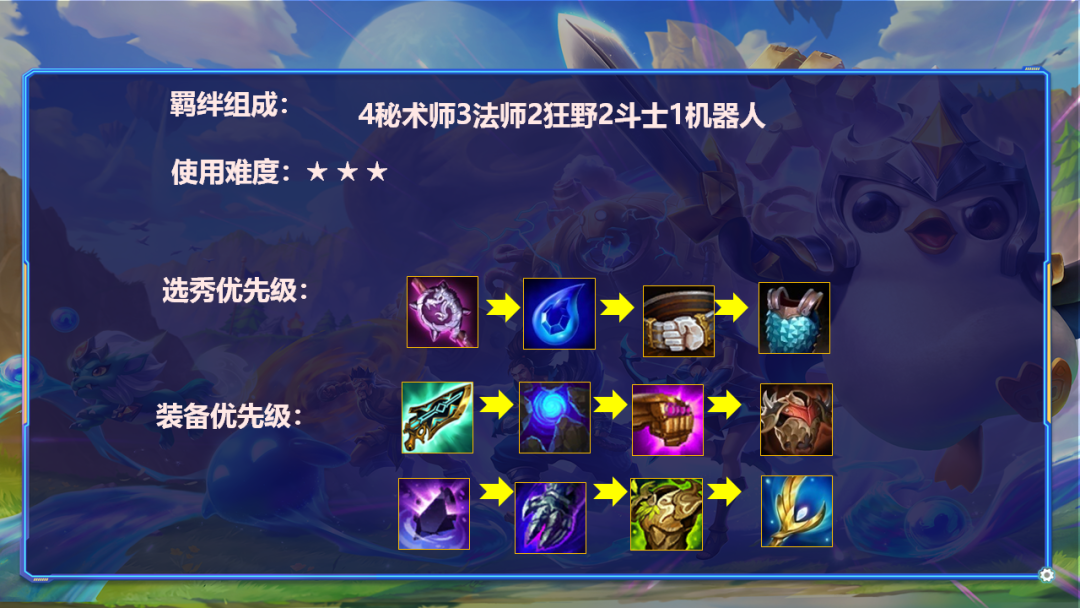 阵容组成:4秘术师3法师2狂野2斗士1机器人