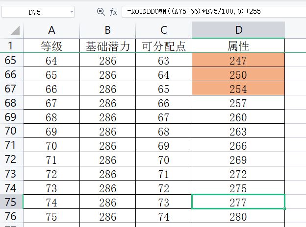 ROUNDDOWN((A75-66)*B73/100,0)+255