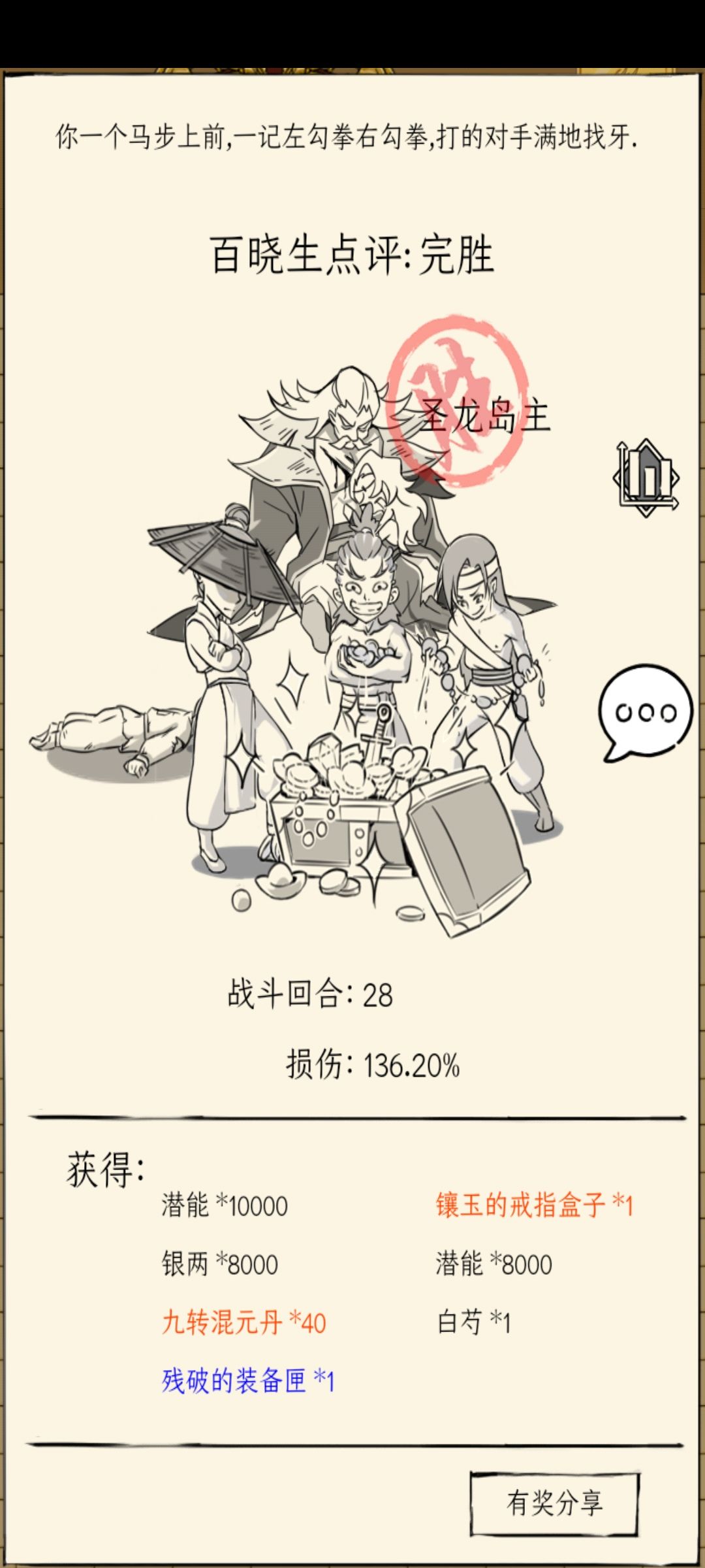 正式服上线,本以为难度会降,结果没降,仁者见仁,如果想试着打着玩可以去,如果想和威虎山精英一样每周打是非常不建议的,氪佬除外,奖励吧,一次大概500九转+一个灵芝,这是单吃的奖励,队伍平分没这么多九转,一次一小时以上,新队伍还要磨合配合,一个半小时以上,两次要三小时,而且非常费药,一次圣龙岛5-10ssd,n多毒