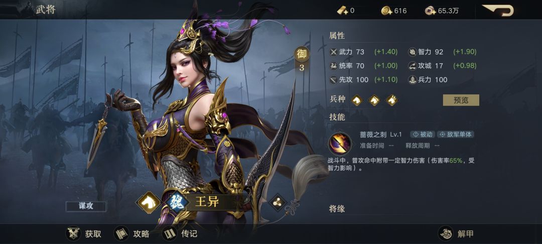 与援军一起击溃马超。王异是一个极有正义感的女子,执意要丈夫起兵讨伐马超为上司报仇,丈夫但以在马超处作人质的儿子的安危,她却厉声说:“雪君父之大耻,虽丧身亦不惜,何况一子乎!君若顾子而不行,吾当先死矣!”此等女子从古至今实在是少见!