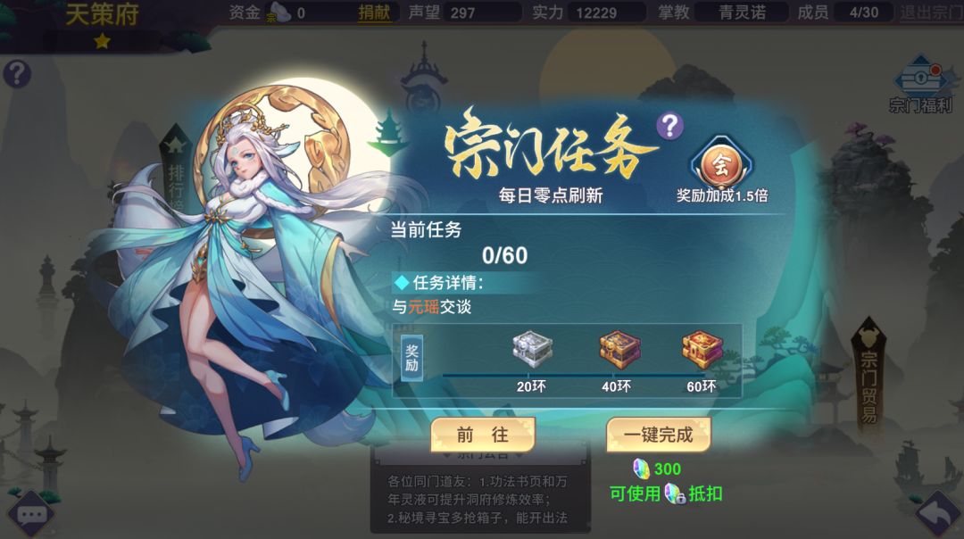宗门任务:每日刷新的奖励活动,一天可以完成60环,可以获得高级招募书,绿液,修炼卷轴等多种奖励。