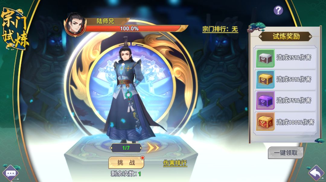 宗门试炼:一共有七位BOSS需要挑战,每日可挑战一次,击杀后解锁后面的BOSS,根据造成的伤害可以领取对应的宝箱奖励,奖励为宗门贡献和少量灵气。虽然奖励没有特别丰厚,但是蚊子腿也是肉,不要白不要。