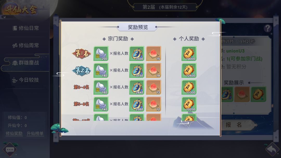 搭配完成之后就是喜闻乐见的战斗阵容,到了这一步就是实打实的看实力了,一切听天由命,但是尽量选择活跃人数多,大佬多的宗门,这样最终获得的奖励也会更多。