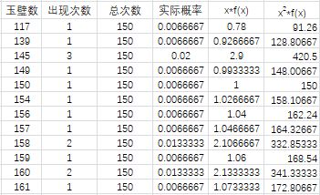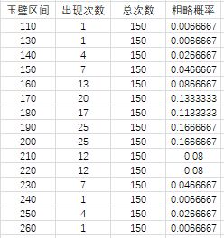2.统计各个数据出现的次数及其概率,部分数据如下