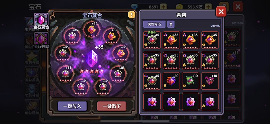 一块满10星宝石需要15个同品质,21个同名宝石,最高有35级