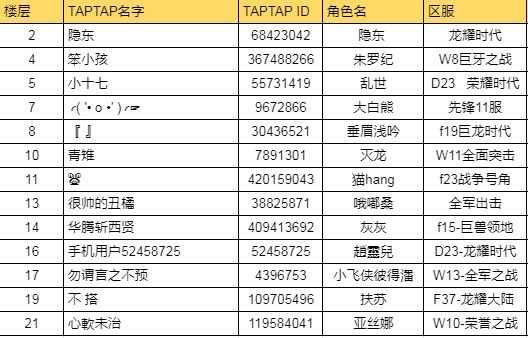 下列为随机挑选并符合参与的楼层名单,奖励会在1-3个工作日进行发放,届时请多关注游戏内邮箱哦。