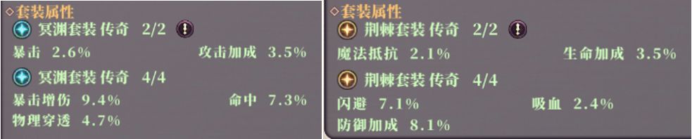从套装属性来看,冥渊套装主进攻,荆棘套装主防御,由于影刃的定位是近战爆发输出,所以影刃对于套装的选择应该是冥渊套装(极个别的可以选择荆棘套装,比如千棘)