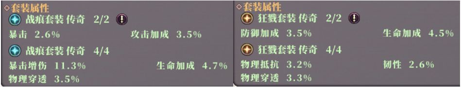 从套装属性来看,战痕套装主进攻,狂戮套装主防御,由于战士的定位是近战输出,所以大部分战士对于套装的选择应该是战痕套装(选择走防御战路线的可以选择狂戮)