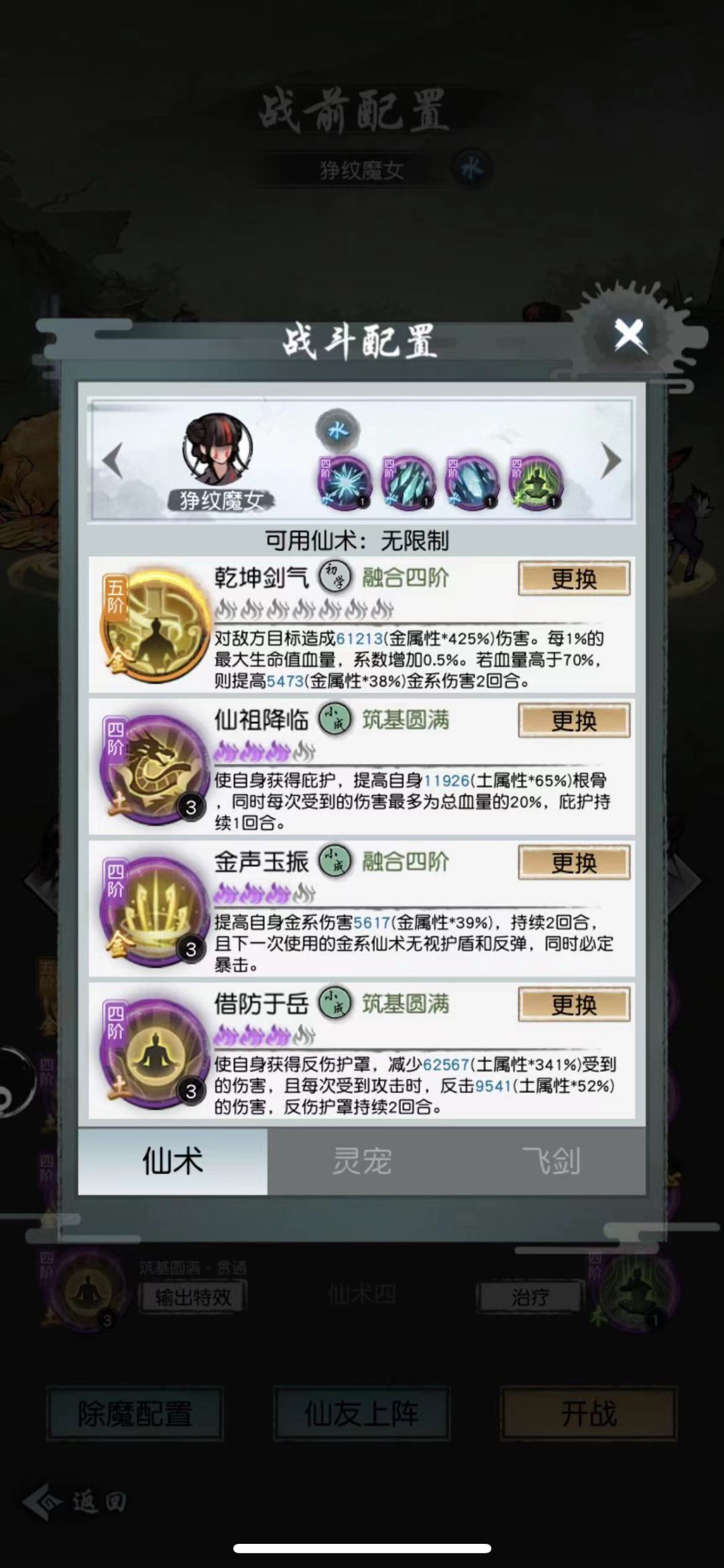 与之前战斗有所不同的是,在除魔副本中,你需要与仙友一同出战。在首次进入战斗的战前配置界面,道友可以为仙友配置专属的仙术、宠物及飞剑。玲珑也悄悄提醒大家,仙友仙术的搭配可以结合仙友自身的属性,这样可以提供仙友的战斗能力哟~