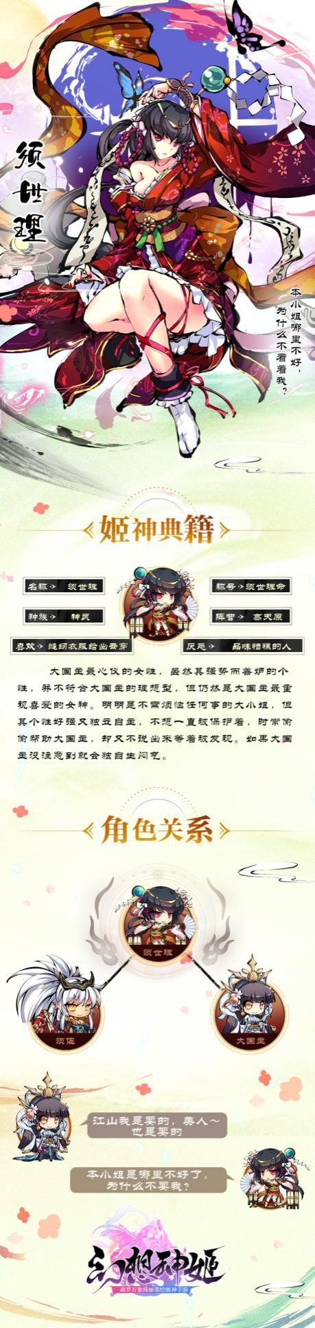 须世理身为大国主最喜爱的女神,性格上好强且独立自主,还是一个十足的颜控,对长得漂亮的人有先天好感,喜欢也擅长缝制华美衣服,并且无法忍受长得好看人却有着糟糕的穿着品味,时常因为看不下去就亲自动手将对方从头到脚打扮一番。(小八可不想被随便打扮