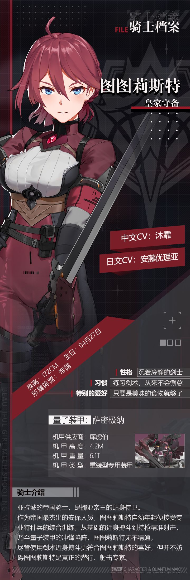 作为帝国最杰出的安保人员,图图莉斯特自幼年起便接受专业特种兵的综合训练,从基础的近身搏斗到持枪精准射击,乃至量子装甲的冲锋陷阵,图图莉斯特无不精通。