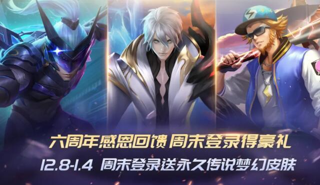 六周年感恩回馈,12月8日-1月4日期间,每周周末(周六、周日)登录免费抽永久传说、梦幻皮肤!