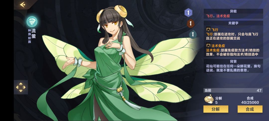 流萤这张卡是新版风系非常实用的卡之一,自带飞行魔免,除了几个特殊的部署以外,(比如砍头,侠女)对面前期根本解不掉她,拿她一点办法没有,尤其是我们给她打上斩星令以后,对面更是要抓狂😫,解又解不掉,打我们,她又能帮我们回血,尤其在配合化蛇,前期的压力一下就小了,快攻想冲死我们异常艰难,尤其我还带了2张妖影,1张碎魂,面对快攻绝对足够了!