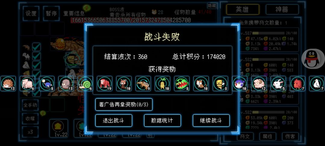 元素选择方面我这次是7金3水2火9风,270波左右就把元素打完了,最终死在BOSS关,意味着风打少了,可以酌情减少别的元素,多打点风。