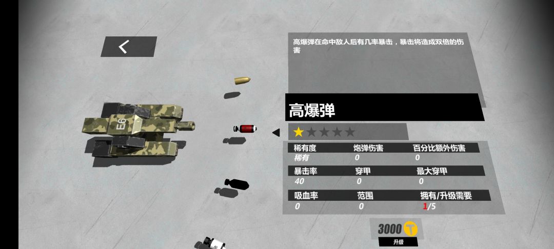 外观为黄色的高爆弹,个人习惯叫做黄高爆,提供额外伤害,但他虽然作为高爆弹,是不提供暴击的,他的效果仅仅只是增加伤害,朴实无华,但很实用,虽然没有穿甲,对付强化过装甲的敌人有些吃力,但我还是很推荐大家使用这个炮弹的。