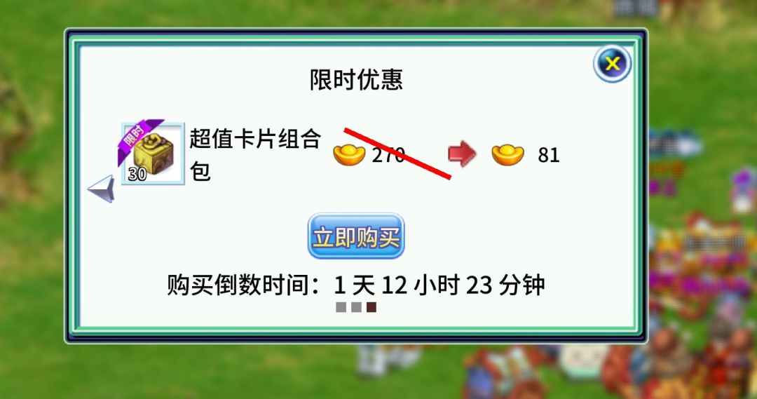 限时商品一般性价比高,卡包组合脸不太黑都能出4-5张卡至少,所以买!尤其卡册,人物和武将都会加不少属性。