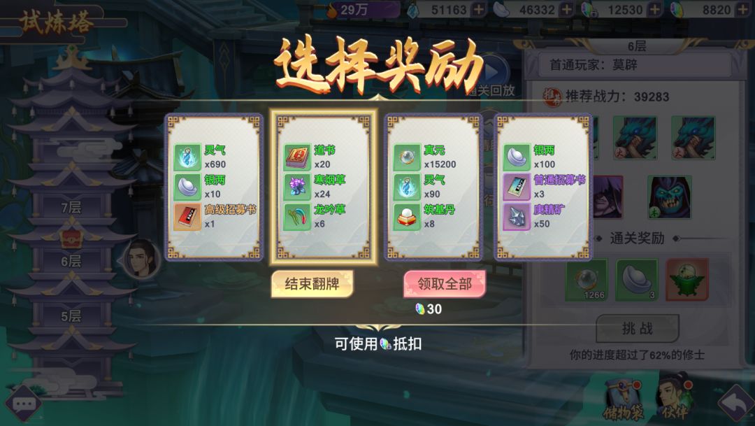 另外在部分特殊层数还有额外的翻牌奖励,奖励一般都比较丰厚,米修个人建议需要的灵石不多,并且奖励还算丰厚,可以选择领取全部。