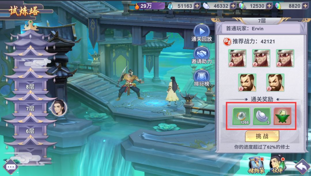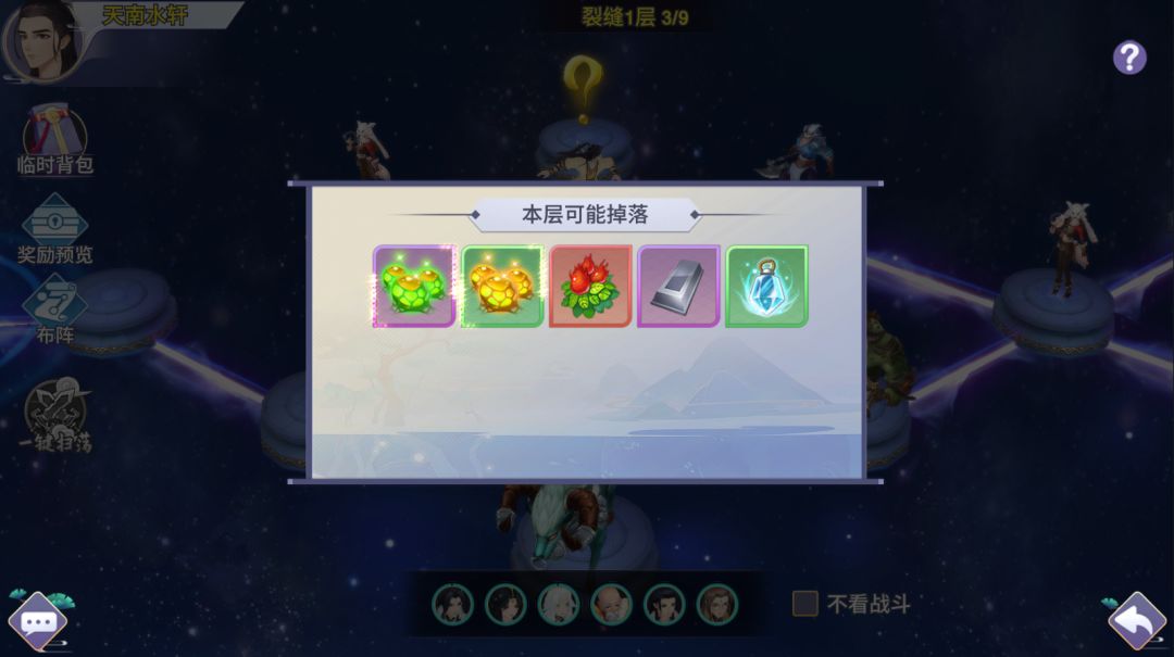 经典的爬塔玩法,每爬过一层都可以获得对应奖励,主要奖励为补天丹,真元和银两。