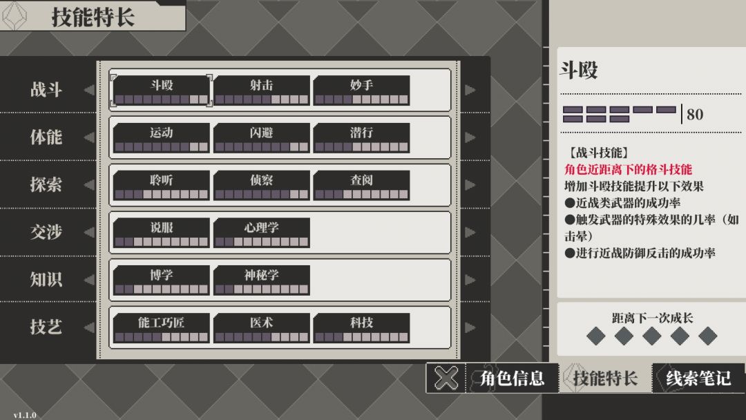 选的是格斗家,加点全点力体敏,技能满斗殴闪避,其次是医术,最次射击(虽然没用上)巧匠。其他没什么用随意点。运气够用就行,用处不大。